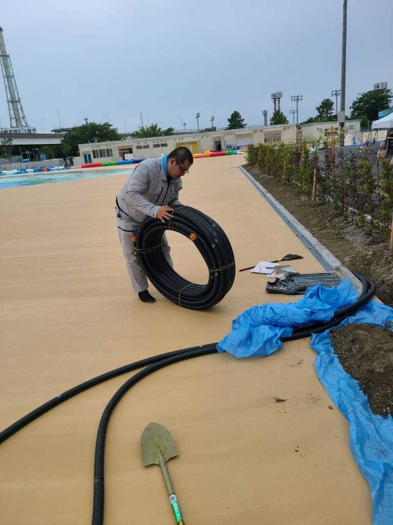 配管埋設の土木作業は雨と炎天下両日あり大変でした。